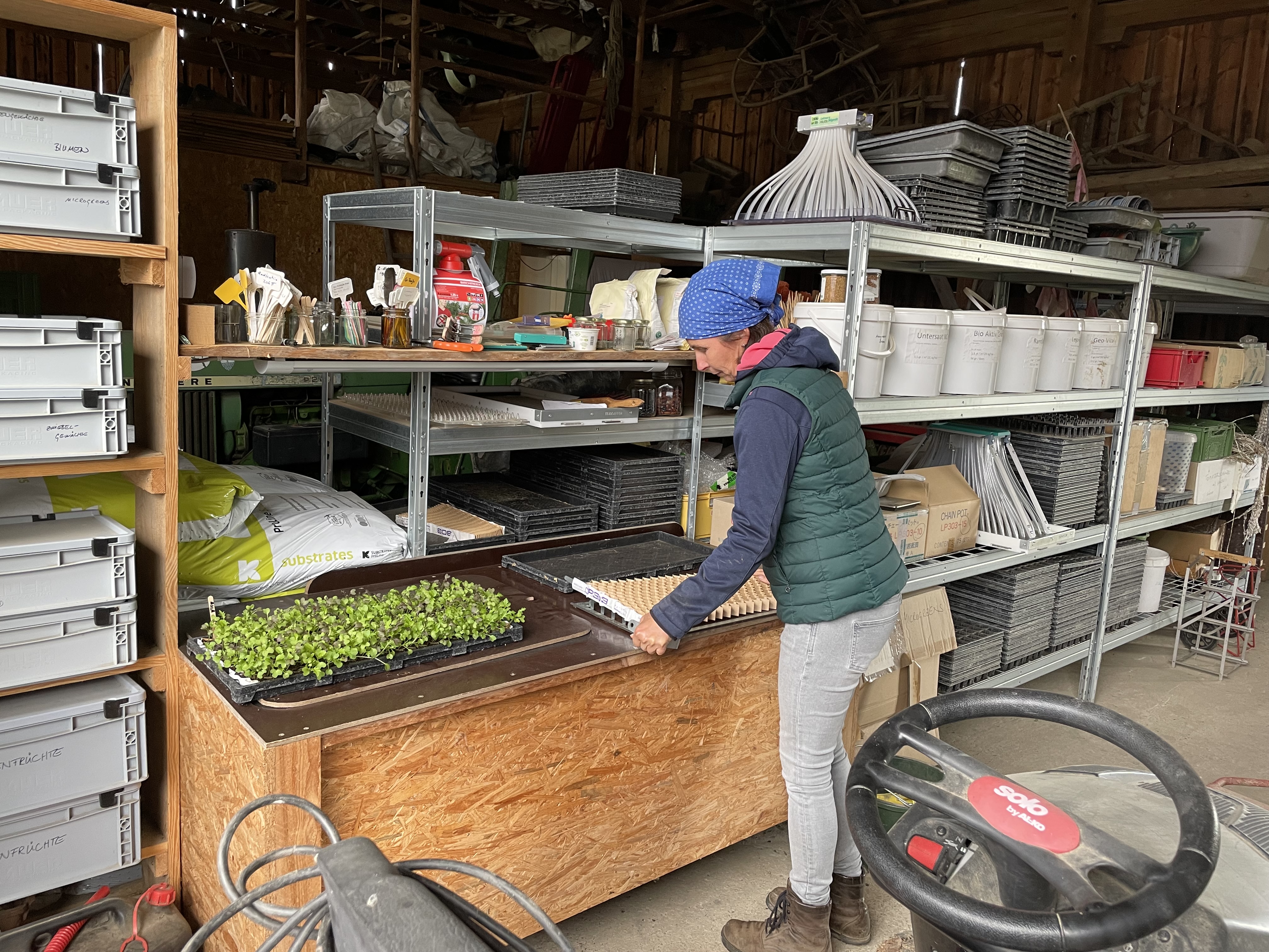 Am Nachmittag folgte ein Ausflug auf den Reisner Hof in Kirchham. Claudia Haspelhuber und Stephan Mendler betreiben die SoLaWi seit wenigen Jahren erfolgreich als Quereinsteiger im Tandem und haben vor allem mit ihrem ausgeklügelten Bewirtschaftungssystem (Wabenstrukturen zur Bepflanzung) überzeugt. Dank der Unterstützung der ILE an Rott und Inn (Regionalbudget) und der Ökomodellregion (Verfügungsrahmen) konnten wichtige Investitionen (zweites Gewächshaus, Gemüsewaschanlage) realisiert werden, die die Arbeit am Hof wesentlich erleichtern.