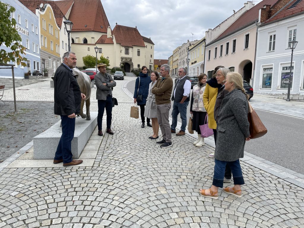 Nach einer angenehm kurzweiligen Fahrt wurden wir am 01.10.2025 vom Ersten Bürgermeister und ersten Vorsitzenden der ILE an Rott und Inn Andreas Jakob des Markts Ruhstorf an der Rott im neu gestalteten Bürgerzentrum “Mathäser” empfangen. Bei Kaffee und Butterbrezen erhielten wir zunächst inspirierende Informationen über die Arbeit der ILE durch Umsetzungsbegleiterin Ursula Diepolder, die durch vielfältige Projekte überzeugen. Gerade der Schwerpunkt auf Tourismus und Landwirtschaft sowie das regelmäßige Veranstalten von Dialog-Foren zur Erarbeitung unterschiedlicher Themenbereichen ist dabei besonders aufgefallen. Auch der Einsatz des Regionalbudgets wurde detailliert besprochen – Ursula Diepolder gab Einblicke in die Arbeit des Entscheidungsgremiums und in die Umsetzung von ILE eigenen Projekten.